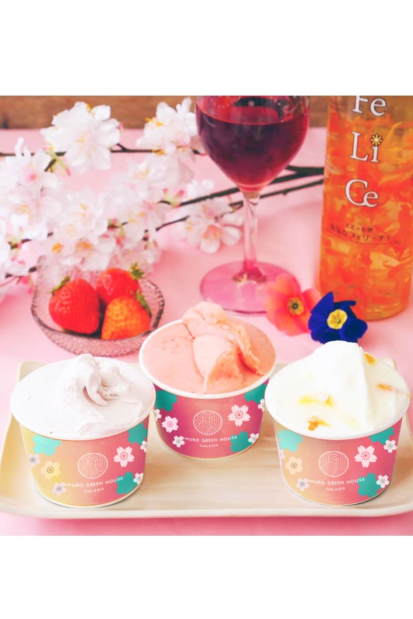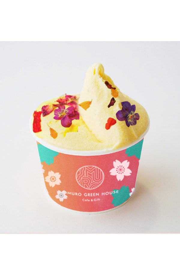 おむろ限定の京都産のワインを使用したジェラートに、当店で自家栽培している食べられるお花“エディブルフラワー”を使用した大人のジェラートアイス。